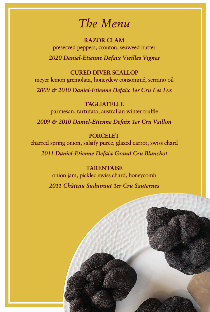 Don’t miss this chance to taste six of the sublime Chablis of Daniel-Etienne Defaix alongside a five-course menu by Chef Ron Paprocki during our first all-Chablis wine dinner.